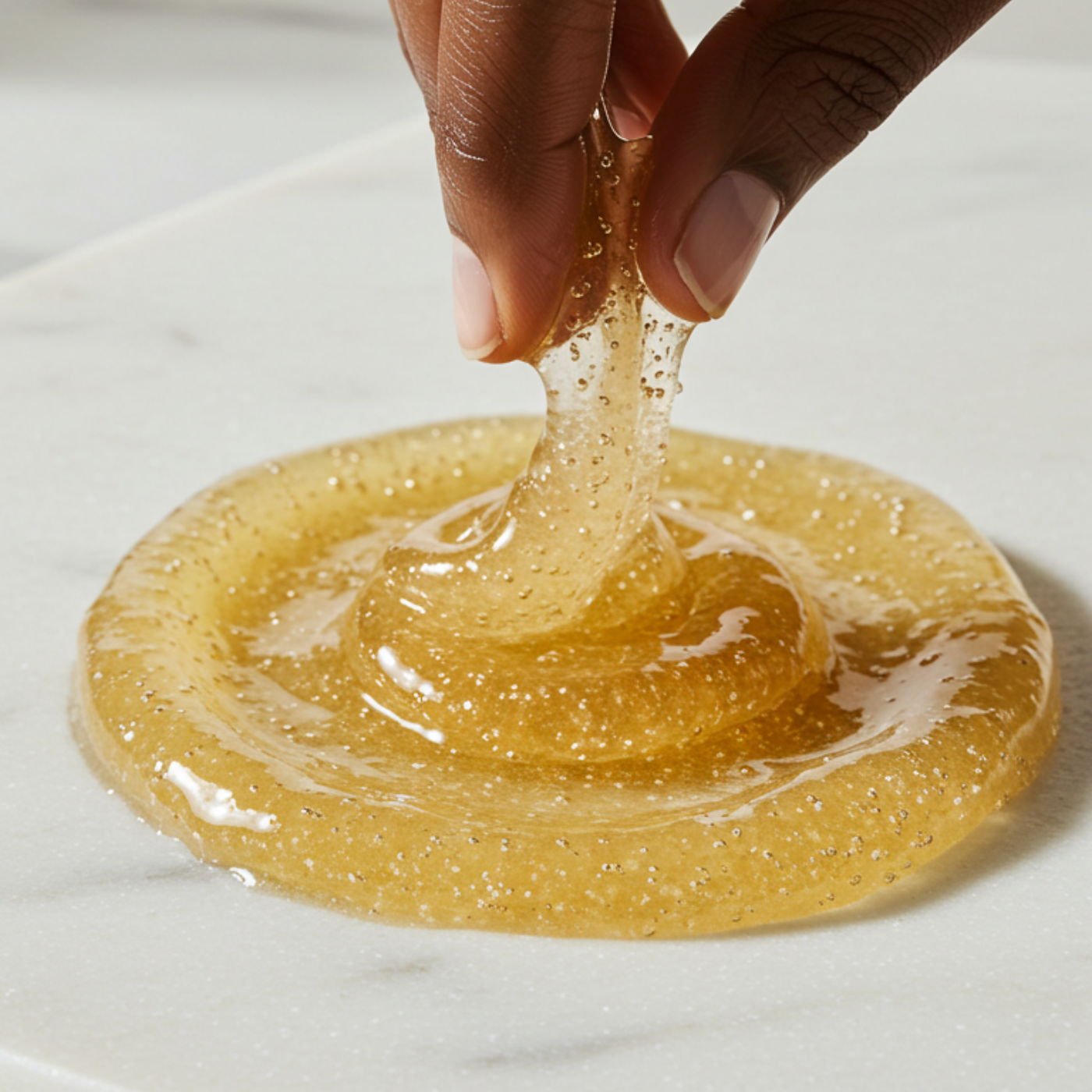 Hand applying a bottle of body wash with text highlighting benefits on a brown background